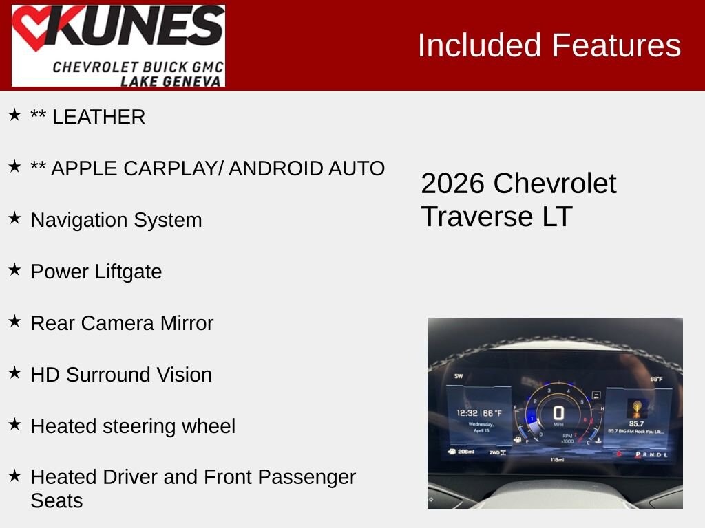 Whether you're taking the family on a road trip or running errands around town, the 2026 Chevrolet Traverse LT 2LT is the perfect companion. Experience the perfect balance of style, technology, and capability for yourself. Call, email, or live chat with one of our friendly sales professionals now to schedule your test drive!