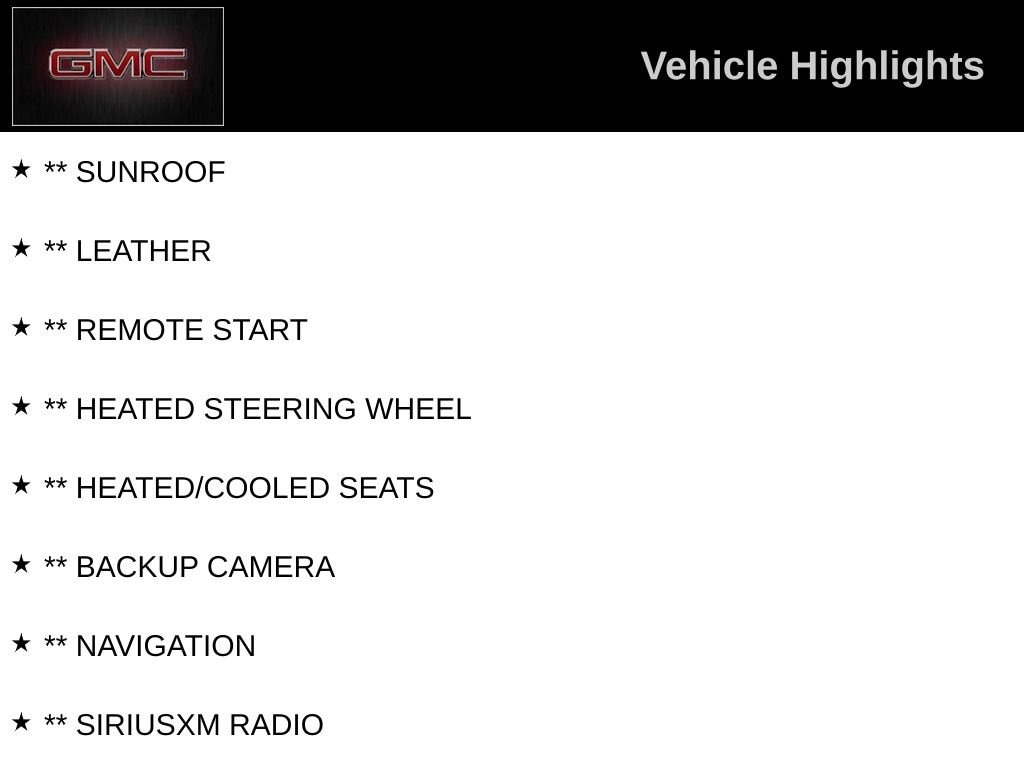 ** SUNROOF, ** LEATHER, ** REMOTE START, ** HEATED STEERING WHEEL, ** HEATED/COOLED SEATS, ** BACKUP CAMERA, ** NAVIGATION, ** SIRIUSXM RADIO, ** BLUETOOTH, 4WD, 10 Speakers, 4-Way Power Driver Lumbar Seat Adjuster, 4-Wheel Disc Brakes, Adaptive suspension, Air Conditioning, AM/FM radio: SiriusXM with 360L, Audio memory, AutoSense Hands-Free Power Liftgate, Brake assist, Dual-Pane Panoramic Power Sunroof, Exterior Parking Camera Rear, Heads-Up Display, Heated front seats, Memory seat, Navigation system: GMC Connected Navigation, Panic alarm, Power driver seat, Power Liftgate, Power-Retractable Assist Steps, Security system, SiriusXM w/360L, Speed control, Sun & Power Step Package.