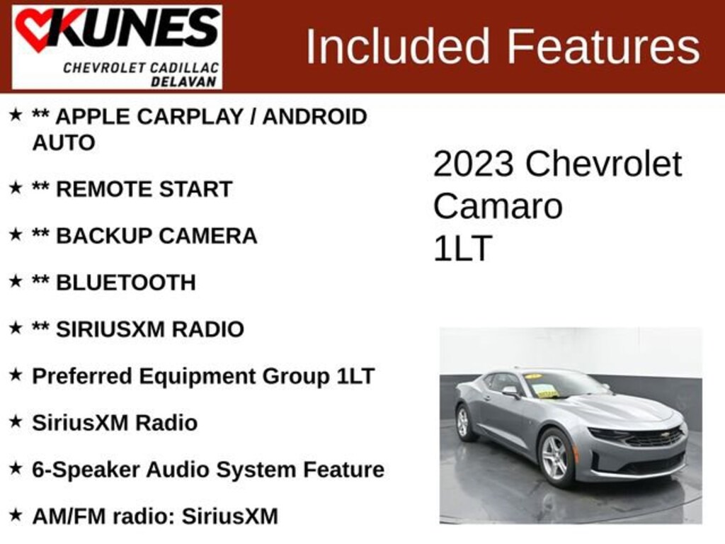 2023 Chevrolet Camaro 1LT Sharkskin Metallic RWD 2.0L TurbochargedRecent Arrival! CARFAX One Owner.NO FEAR LIFETIME CERTIFIED PREOWNED **Over $2,895 of value at no cost!LIFETIME WARRANTY!3 Day Exchange Policy!Complimentary powertrain warranty with ability to upgrade to fully comprehensive coverage and/or extend up to 125,000 miles!125+ Point Inspection by our factory trained ASE Certified technicians and reconditioned to the highest standards.Complimentary AutoCheck History ReportComplimentary AutoCheck Buyback ProtectionFinancing for Everyone - Guaranteed credit approval regardless of credit history!Over 30 lenders who compete to get you the best financing termsNo payments for up to 90 days!Weekly, Bi-Weekly, and Monthly Payment Options for all buyers!First Free Oil Change!Trade anytime policy - cars, trucks, boats, RVs, motorcycles - as long as we don't have to feed it, you can trade it! Sunroof 8-speed automatic transmission Rear-wheel drive Turbocharged 2.0L I4 engine Cruise control Power mirrors Power driver and passenger seats Adjustable leather steering wheel Bucket front seats, cloth upholstery Rear defrost and pass-through rear seat Dual-zone climate control and air conditioning Aluminum wheels with performance tires Keyless entry and remote engine start Satellite radio, AM/FM, Android Auto, Apple CarPlay, Bluetooth WiFi hotspot capability Power windows and door locks Floor mats, front reading lamps Security system and tire pressure monitor Multiple airbags, including front, knee, side, and rear Stability control, brake assist, and traction control