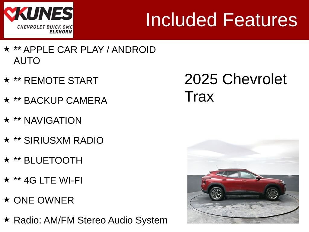 2025 Chevrolet Trax LT 1.2L Ecotec Turbo DOHC DI w/VVT 6-Speed Automatic FWD Clean CARFAX. CARFAX One-Owner. 28/32 City/Highway MPG
